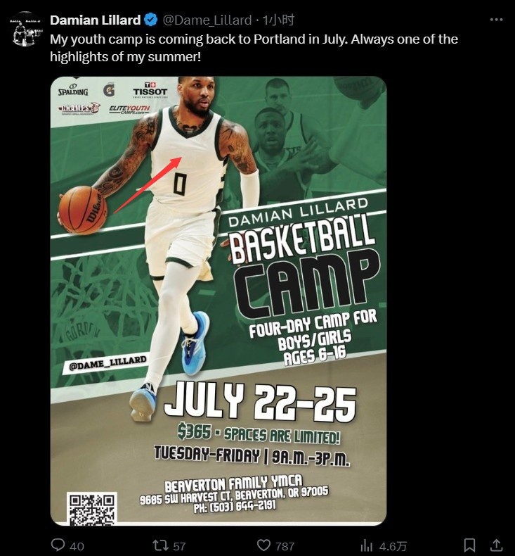 5月13日讯 今日,雄鹿球星利拉德在社媒上宣布, 自己将在7月23日-26日回到波特兰举办青少年篮球训练营。