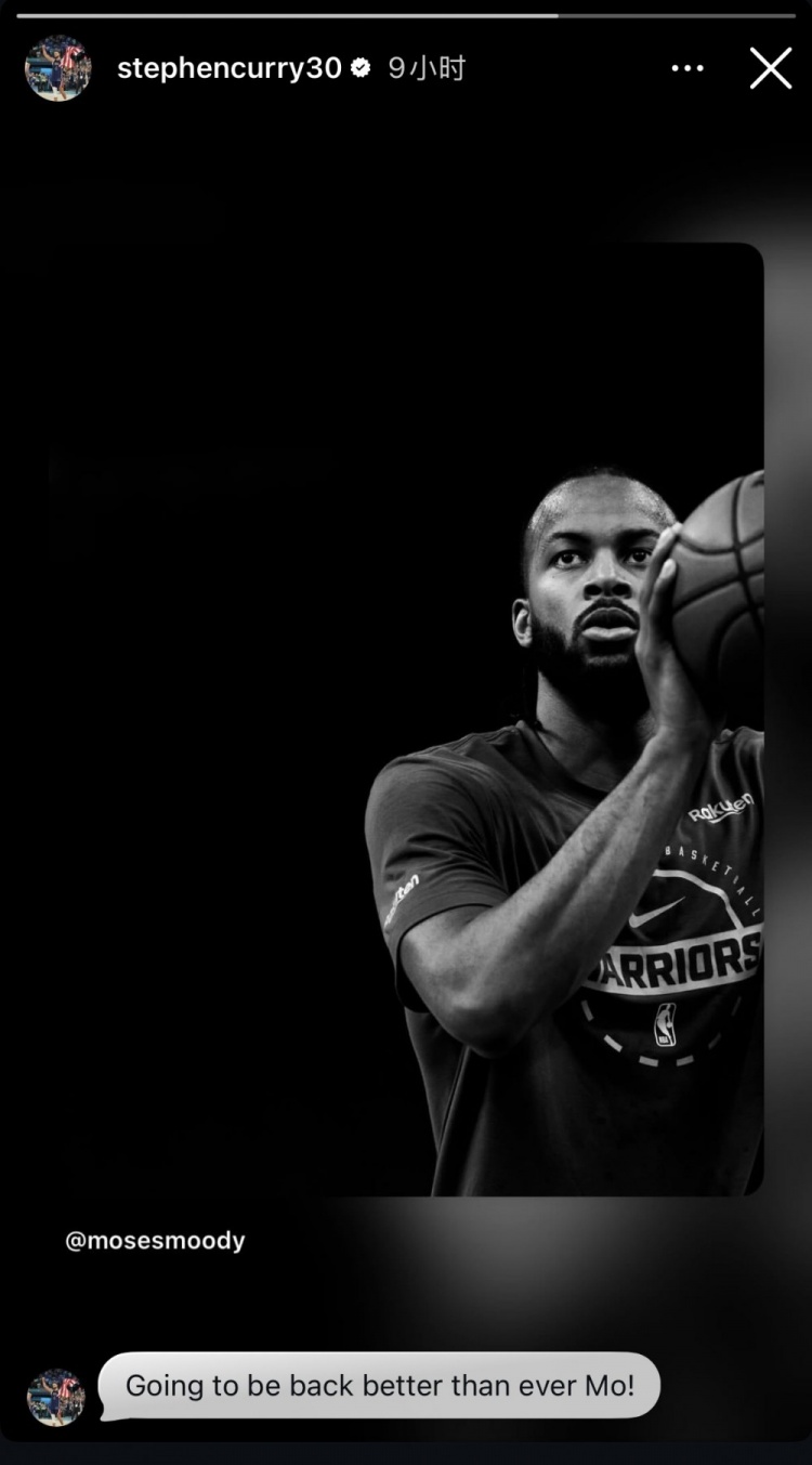 库里转发了队友穆迪向外界关心其伤情致谢的帖子,并评论道:“摩西,你将在回归后比以往更强大!”